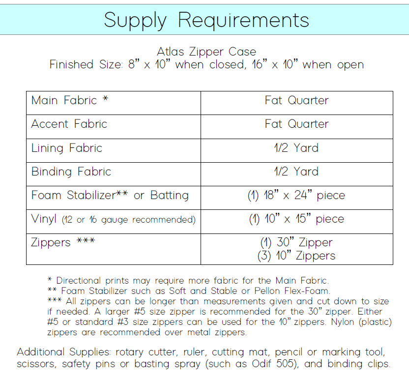 The Atlas Zipper Case pattern includes full color, step-by-step graphics walking you through every step of creating your bag. The pattern includes instructions for cutting the bag pieces using a ruler (in inches) and all directions are in English. There is one template included in the pattern that will need to be copied or traced to a new piece of paper for rounding the corners (or a 2.5" diameter circle will also work). A larger size #4.5 or #5 zipper (also called a "handbag" or "long pull" zipper) is recommended for the 30" zipper required. For the vinyl, 16 or 12 gauge weight is recommended.