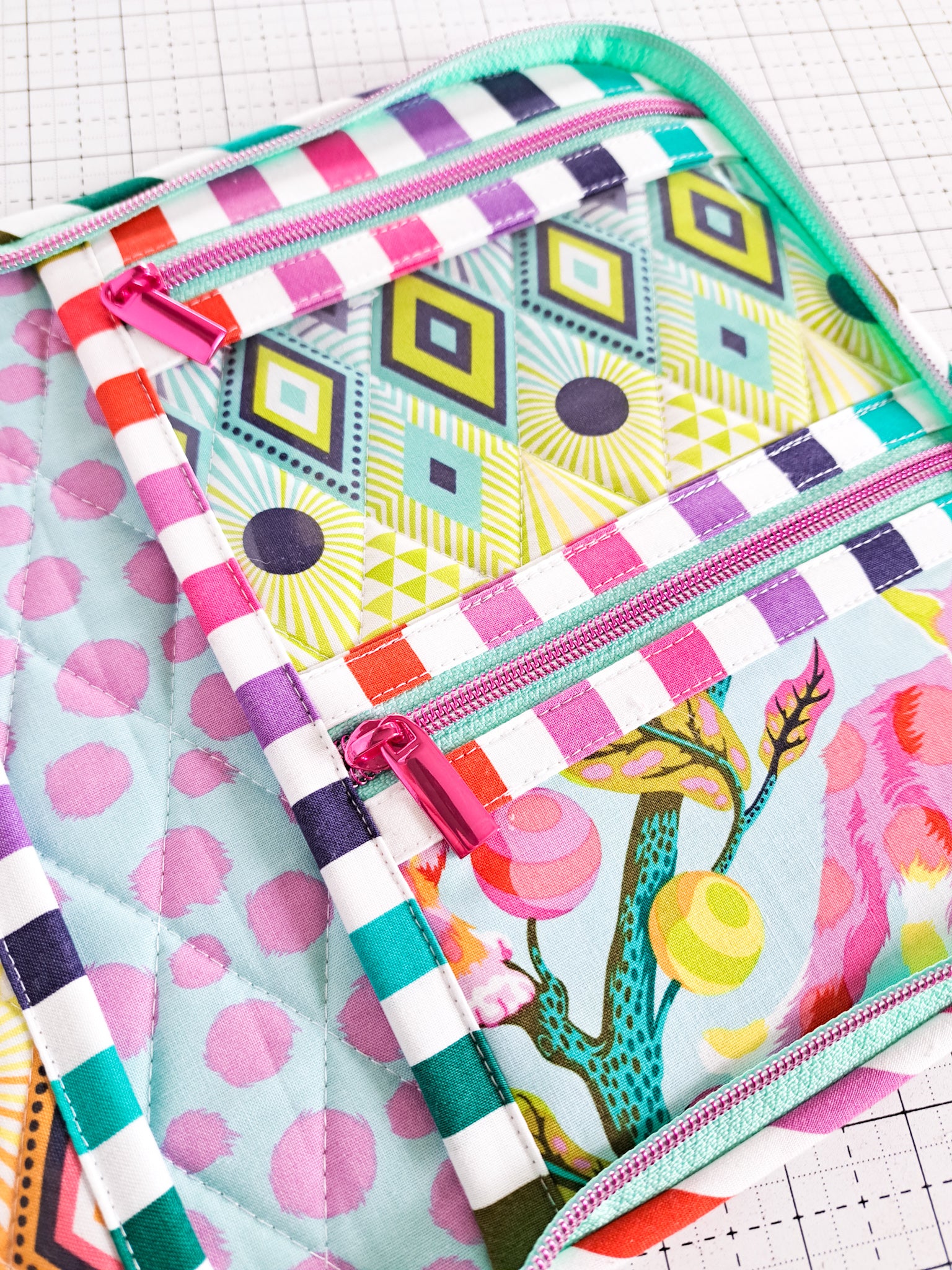 Images show the Atlas Zipper Case in Tula Pink's Tabby Road Deja Vu and Lella Boutique's Lovestruck fabric lines.